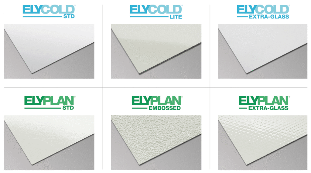 Elycold is a high-quality fiberglass laminate, produced discontinuously with a polymerization process at ambient temperature that ensures excellent flatness and an extraordinary seamless finish. It is available in widths up to 3.400 mm and thickness from 1 to 3.6 mm.